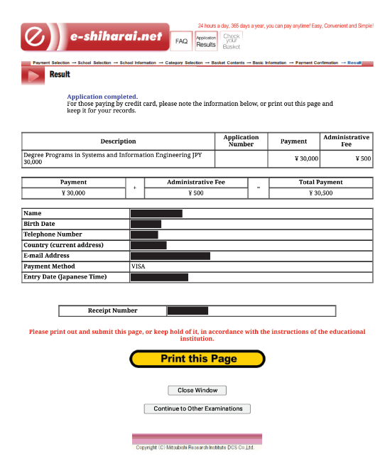 | Proof of payment of examination fee | (1) Applicants who made a credit card payment (2) Applicants who made a convenience store payment | Submit the corresponding document as described below. (1) Print out and submit the “Application Completed” page (After payment is completed, click “Print this page” button to view the “Result”). (2) Submit the receipt portion (certificate of payment) you received from the convenience store. The receipt portion must be pasted on the “Form for Submission of the Certificate of Payment of Application Fee” which can be downloaded from the system after completing web entry. |